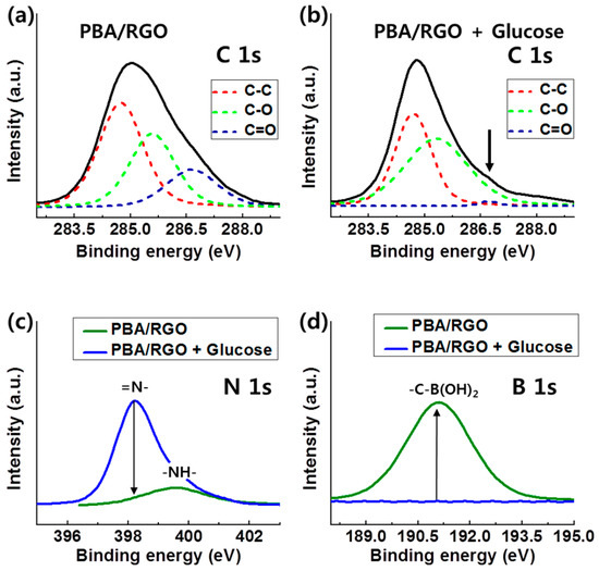 With C 1s, N 1s, and B 1s orbitals, Figure 3 represented the X-ray photoelectron spectra (XPS) results, which provides the information of chemical interaction, of PBA/RGO and glucose combined PBA/RGO. The C 1s results completely match with sp2 C–C bonding corresponding to 284.8 eV, C–OH/O–C–O, and COOH near 286 eV [27]; the intensity of sp2 at 284.8 eV was the most dominant in all features of the carbon based sample. PBA/RGO was reduced by adding glucose solution, and its shoulder peak at 286.7 eV decreased owing to new binding between PBA and glucose in the replacement of PBA/RGO functional groups [28,29]. The N 1s features consisted of three individual peaks appearing at 398.2 eV for =N–, at 399.7 eV for –NH–, and at 401.1 eV for NH3+. PBA/RGO exhibited mainly =N– feature at 398.2 eV from PBA before adding glucose. After glucose treatment, PBA/RGO showed decrement in =N– binding, and small –NH– features remain in the N 1s orbital of XPS characterization. In the B 1s, PBA/RGO with glucose presented –C–B(OH)2 feature at 191.6 eV [30]. In PBA/RGO, 3–aminophenylboronic acid that is able to interact chemically with glucose molecule has the nitrogen in amino and boron in boronic acid. The XPS features of these two atoms remarkably showed the existence of a functional group on PBA/RGO and interaction with glucose [31].