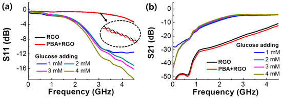 After adding glucose solution, the transmission was significantly increased through the whole frequency range. The reflection parameter in Figure 4a showed that the reflection property did not considerably change under 1 GHz, and over 2 GHz the reflection magnitudes of glucose solutions were substantially decreased compared to that of the bare PBA/RGO line. PBA/RGO device provided considerable change in the S11 and S21 result after dropping glucose solution. Such S-parameter change indicates that the transmission increased with a decrement of signal loss in the interconnector. The interaction between PBA and glucose assisted in reducing the signal loss and the signal reflection in the PBA/RGO interconnector [32,33]. Many hydroxyl groups of the diol, which significantly reduce the conductivity of graphene and interfere signal transmission, in PBA/RGO were removed with condensation reaction of PBA and glucose [34]. As the concentration of glucose increases from 1 to 4 mM, S11 magnitude of PBA/RGO device was decreased. Although variations also occurred in the S21 result, it is too small to conceive as a sensor characteristic.