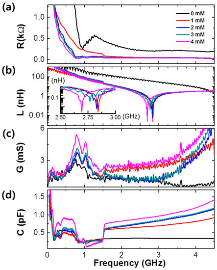 As the concentration of glucose increased, the resistance (Figure 5a) generally decreased and the conductance (Figure 5c) and capacitance (Figure 5d) increased owing to the enhancement of conductivity with the RGO reduction, which resulted from the condensation reaction (Figure 1b) between PBA and glucose molecules. In particular, in Figure 5b, the inductance provided a resonance dip shifting according to glucose concentration. The dip shift to a lower frequency can be demonstrated through the relation between the resonance features and the viscosity of glucose solution [38,39]. Adding glucose on the PBA/RGO interconnector surface results in the enhancement of viscosity and acts as a damper, especially in the condition with the boronic acid [40]. Under the RF system, the conduction transferring the carrier to the opposite port was interfered with by the inductance and took a longer time when the inductance of the device had a high magnitude.