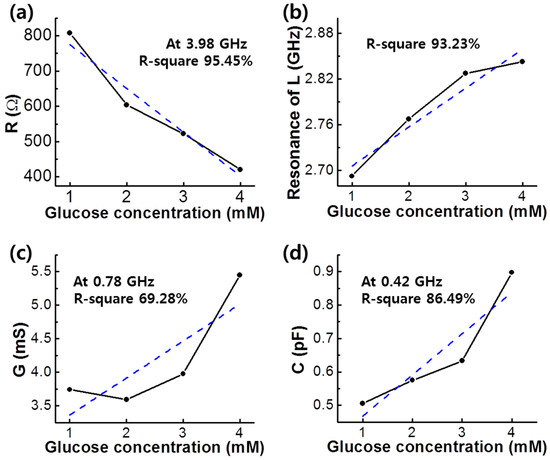 Linearity of the PBA/RGO glucose biosensor was investigated with the R-square between the fitted results and experimental data according to glucose concentration. The linearity of the resistance result (Figure 6a) showed the highest linear response for glucose with 95.45% of R-square, and that of the inductance result (Figure 6b) corresponded to 93.23%. Shunt conductance and shunt capacitance, determined by the interaction between interconnector and substrate, provided worse linearity.