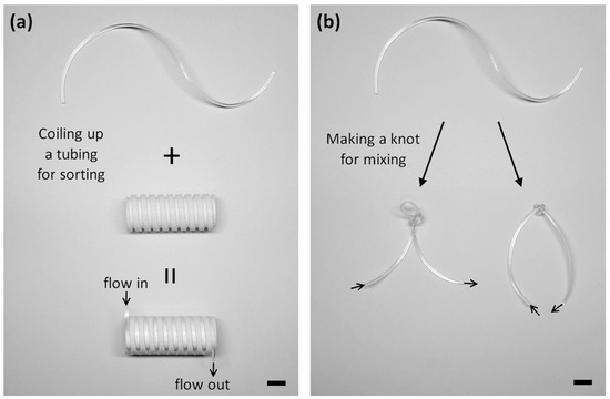 Photographs of reconfiguring flexible tubing for microparticle separation and fluid mixing. (a) A spiral microchannel is configured for microparticle separation by coiling the tubing onto a 3D-printed grooved barrel. (b) The tubing knots generate abrupt changes in a flow direction to mix laminar flows through the tubing. It shows two different ways of knotting tubing (knot with or without an inner loop) and presents that even one without microfluidic experience can construct various channel geometries by simply making knots of tubing. (scale bar: 1 cm)