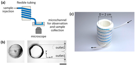 Microfluidics is a technology capable of controlling and transferring small quantities of liquids, ranging from nanoliters to microliters, which enables multiple biological assays and high-throughput screening. Particle separation and fluid mixing are important in biochemical and clinical applications for the identification and analysis of specific target molecules or cells. To achieve this, microfluidic channels have been integrated into miniaturized (lab-on-a-chip) and point-of-care testing devices as indispensable components with various advantages, such as ensuring precise control of a fluid and reducing the time and costs associated with routine biological analysis [1]. In particular, microfluidic technologies play a key role in the separation of cells or microparticles and the rapid mixing of fluids, which have been demonstrated with microfabricated, complicated structures, such as a chaotic mixer, serpentine channels, herringbone structures, and a contraction-expansion array channel [2,3,4,5,6,7,8].