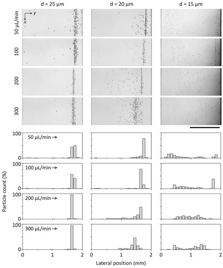 Stacked images and distribution plots show the distributions of microparticles according to the particle diameter and the flow rate. The flow direction is along the x-axis. (scale bar: 1 mm)