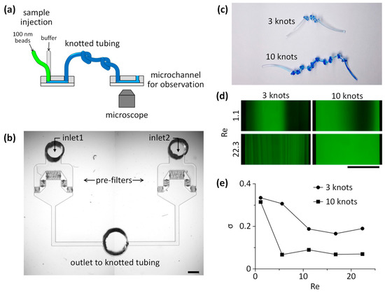 Mixing of fluids using knots of flexible tubing. (a) Schematic showing the experimental setup for observation of the spatial distribution of fluorescent nanoparticles after mixing. (b) Photograph of a microchannel for the infusion of two types of fluids to assess the mixing efficiency (one with 100 nm fluorescent nanoparticles and the other one without the particles). The outlet is directly connected to the flexible tubing with serial knots without premixing. (c) Photograph of knots in the tubing, which induce abrupt changes in a flow direction. (d) Fluorescence images after the mixing of the buffer solution (no fluorescent nanoparticles) and the solution containing 100-nm green-fluorescent nanoparticles. (e) The degree of mixing efficiency can be obtained from the standard deviation of the fluorescent intensity across the channel. The 100-nm fluorescent particles in laminar flows were completely mixed when flowing through 10 serial knots of tubing, even at low Reynolds numbers, in comparison to the tubing with 3 knots. (scale bars: 1 mm)