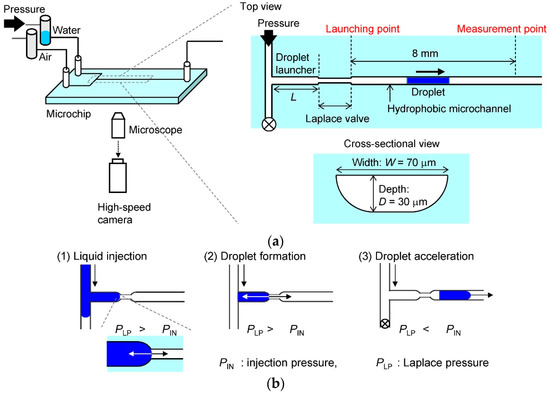 The microfluidic process used for droplet formation and acceleration (Figure 1b) resembled that used in our previous reports [7,11]. A key feature of the process is the Laplace valve [14], which utilizes the Laplace pressure given by the Young-Laplace equation, PLP = −4γcosθ/Dh, where γ is the surface tension. The Laplace pressure of the valve was calculated to be PLP = 8.4 kPa, using the surface tension at the water–air interface, γ = 72.3 mN/m. First, water was injected into the droplet launcher at a pressure below the Laplace pressure (PIN < PLP). Then, air was injected into the channel to form the microdroplet (PIN < PLP). Finally, a pressure higher than the Laplace pressure was applied to accelerate the droplet in the acceleration channel (PIN > PLP). The volumes of the microdroplet were 1.7 and 3.4 nL, as estimated using the size and length of the droplet launcher.