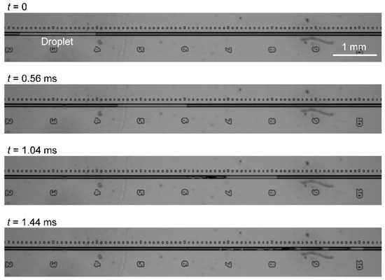 Figure 2 shows the motion of an accelerated droplet in a microchannel with L = 2.00 mm at an applied pressure of 1800 kPa. A video of the accelerated droplet is presented in the Supplementary Material (Video S1). Within 1.5 ms, the droplet moves through the channel, begins to split from its tail, and disappears. Since the volume of the droplet is only in the order of nL, the influence of water evaporation on the droplet splitting and disappearance must be considered. In order to verify the influence, we estimated the time it would take for the nL droplet to evaporate, based on the evaporation rate of a water droplet on a solid surface reported in a previous study [15]. Assuming that evaporation occurred at the air–water interfacial area in the cross-section of the channel, the time for the evaporation of the nL droplet was estimated to be 10 s. This time scale is much larger than that for the droplet splitting and disappearance in 1 ms as shown in Figure 2. Therefore, the effect of evaporation is considered to be negligible.