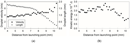 In this study, the droplet motion was captured using a high-speed CMOS camera at frame rates of 13,333 to 25,000 Hz. The droplet position in the images captured was determined with a spatial resolution of 10 μm, which corresponds to the image pixel size, given by pixel size/magnification. Then, the droplet velocity and droplet length were determined at a measurement position 8 mm away from the launching point.