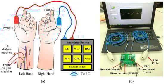 In this study, the system is planned to record and monitor the change of blood volume between the left and the right (bilateral) thumb site on the hand. The probe was mounted within the clip at the left and the right thumb to acquire bilateral PPG signals, as shown in Figure 1a. For the analysis requirements, two-channel PPG signals at a sampling rate of 1 kHz are captured synchronously. This signal is then inputted to the embedded system (MSP430, Texas Instruments, Dallas, TX, USA) to provide analog to digital conversion of data and transfer it to a laptop computer with MATLAB (ATA Engineering Inc., San Diego, CA, USA) as the analyzing tool. In a sampling window, the interval of pulse foot (PF)–pulse foot (PF) is also located by the MSP430 to obtain sampling data. The proposed system can provide a promising continuous measurement during hemodialysis treatment, as shown in Figure 1b. The training process and the classifier architecture are two essential parameters to design a classifier. In this study neural network and ESVM-OVR techniques were implemented by MATLAB 8.3-R2014a software.