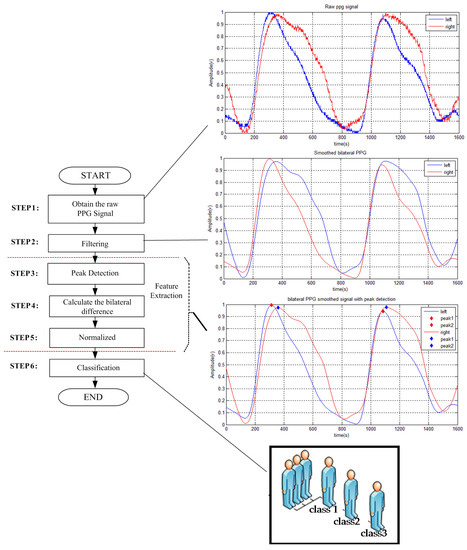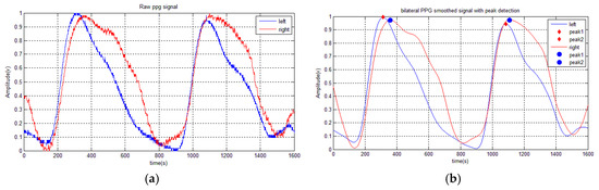 The raw data has to be preprocessed before extracting the bilateral PPG signal features. First, a second-order of infinite impulse response (IIR)-Butterworth low pass filter (LPF) with a 20 Hz frequency cut off is employed to filter the raw data, which removes noise due to physiological signals and motion artifacts.