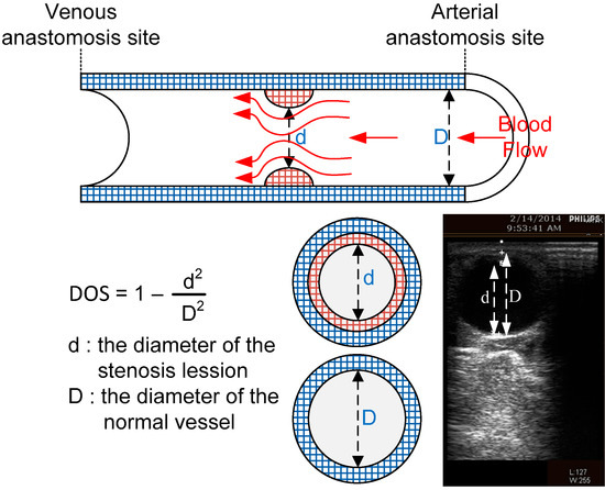 Referring to previous research [13], DOS has become a main reference to grade vascular disease as severe and this can be expressed as , where d is the stenosis lesion diameter and D is the normal vessel diameter in the blood flow direction. Figure 3 shows the area of d and D. If DOS is 100%,this means total occlusion, over 50% usually means the patient requires surgical treatment, and between 30% and 50% means it may have an effect upon the efficiency of hemodialysis. As a result, we followed clinical comments to design three different classes for classification as shown in Table 1.