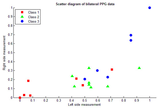 Table 4 presents the result of the DOS calculation with respect to the values of D and d measurement. The ranges of difference patterns after normalization calculation ware 0.00–0.71, 0.11–0.92, and 0.14–1, divided into three classes, respectively. The results of all bilateral PPG features are then plotted as shown in Figure 6.