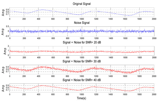 It can be noticed from the Table 5 that the proposed technique with a quadratic kernel function has the most optimum achievement from other common kernel functions, and even the ANN technique. In this study, the proposed technique with a quadratic kernel function is also examined against noise to derive its performance and reliability. There are twenty data samples (raw PPG signals) that have been predicted 100% correct are chosen to perform this examination. The noise constructed by utilizing those raw PPG signals is manipulated by a certain SNR value. Having formed the noise, adding to the raw PPG signal is the next step to obtain a noisy PPG signal. The new twenty data samples are developed by the collection of the noisy PPG signal. The characteristic of the new data samples in comparison with the raw PPG signal (original signal) and noise signal is presented in Figure 7.