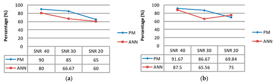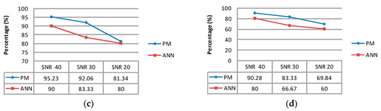 In this step, Table 6 with a SNR = 40 dB indicates that the proposed technique reached its highest level in all statistical parameters. On the other hand, its level declined sharply with a SNR = 20 dB. The proposed technique with twenty new data samples also has been compared with the ANN, as presented in Figure 8. As shown in Table 6 and Figure 8, the proposed technique, in all statistical parameters, has significant predominance against the ANN, which had been evaluated with the noisy PPG signal.