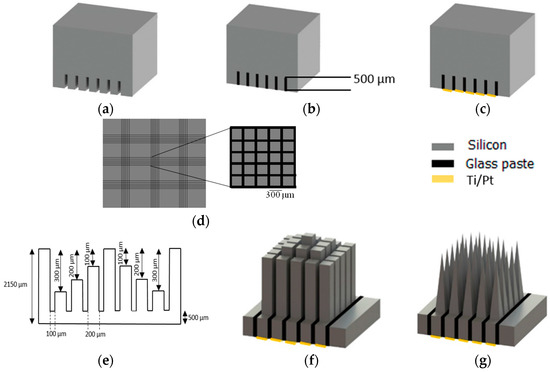To achieve electrodes with variable heights, the frontside (non-glassed side) of the substrate was cut with an ADT 7100 dicing saw using two dicing blades: resin-bond blade (J-014-4000-J, Dicing Blade Technology) and a Ni alloy diamond blade (Disco, ZH05-SD2000-M-90). To produce columns with variable heights, silicon was removed from the top of the substrate with the depths of 300, 200, 100, 0, 100, 200, and 300 µm with an index of 300 µm by the resin-bond blade. The substrate was rotated 90° and silicon was removed from the top with the same cutting protocol. The columns with different heights were separated from each other in two perpendicular directions using the Ni alloy diamond blade with the thickness of 100 µm and to a depth of 1650 µm (Figure 2e). The frontside cuts were aligned with the backside ones. This leaves a 7 × 7 matrix of rectangular columns with the height of 1.35, 1.45, 1.55, and 1.65 mm and 100 µm spacing (Figure 2f). The extra row of columns with the height of 1.35 mm was designed as a dummy row to protect electrodes in the arrays and to improve the uniformity of the electrodes during the etching process.