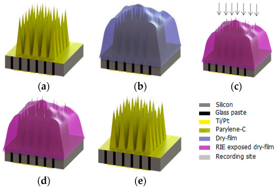 The dry-film and parylene-C were removed from the tips using isotropic and anisotropic reactive-ion etching processes. In the first step, the dry-film and parylene-C films were anisotropically etched by reactive-ion etching (reactive ion etching (RIE), RF source) from the top of the electrode tips at a power of 200 W and a chamber pressure of 100 mTorr for 50 min. In the next step, both films were etched isotropically with a plasma asher (microwave source) from the side-walls of the tips at a power of 150 W and a chamber pressure of 400 mTorr for 10 min (Figure 3c).