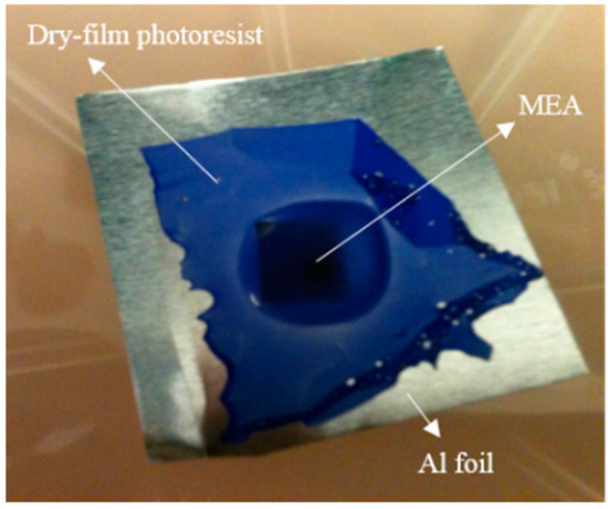 After electrode insulation, a layer of dry-film photoresist (FX900, DuPont, Wilmington, DE, USA) with the thickness of 30 µm was used as a mask to cover the array (Figure 3b). The MEA was placed on a thick Al foil sheet. In the next step, the array was covered manually with a dryfilm using tweezers. The dry-film acts as a tape and not only fixes the MEA on the top of the Al foil but also follows the 3D structure of the electrodes, which results in a uniform tip exposure for variable-height electrodes after the etching process (Figure 4).
