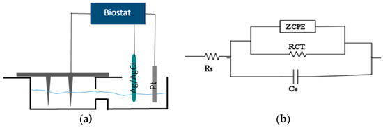 The equivalent circuit model includes a constant phase element impedance (ZCPE) that represents the electrode’s capacitive impedance shunted by a charge transfer resistance RCT, both in series with the solution resistance Rs. Cs is all the shunt capacitance to the ground comprises the capacitance from the metal of the electrode to the solution through the insulation (Figure 5) [43,44]. When the current is applied to the electrode-electrolyte interface, a double-layer of charges simulates a charged capacitor. The double-layer capacitance occurs from the movement of charges and ions at the interface. Layers of charges are formed by two mechanisms; Faradic and non-Faradic transfer. Faradic reactions can be reversible or non-reversible and are undesirable for biological purposes since the tissue is altered during the oxidation and reduction processes resulting in pH changes that can damage the tissue and the electrodes. Non-Faradic charge transfer is a reversible process and is defined by the motion of charges at the interface to form a charge separation region which is the origin of the double layer capacitance. The latter can be modeled as a parallel-plate capacitor whose capacitance is given by: