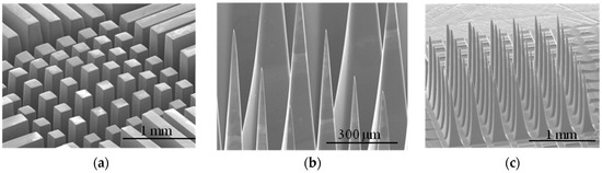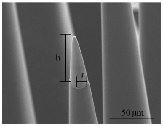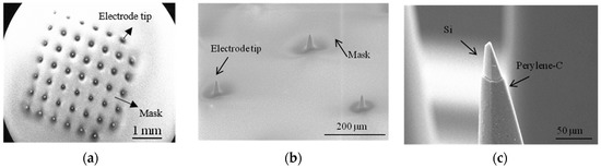 SEM images of a 7 × 7 matrix of rectangular columns with different heights were acquired after the backside dicing and glassing processes (Figure 6a) [28]. The rectangular columns of the electrodes were converted to sharp needle-shaped tips (Figure 6b,c). Etching duration causes significant change in the geometry of the electrodes.
