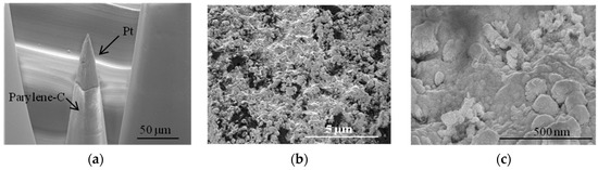 SEM images of microelectrodes after tip-metallization with Pt (a–c) at different magnification. Pt has granular morphology.