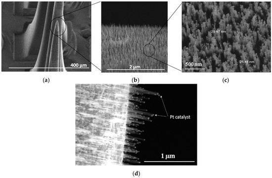 To convert the rectangular columns to sharp tips, a wet etching process composed of 49% hydrofluoric acid and 69% HNO3 in a ratio of 1:19, was used [31]. The sample was placed in a 2 cm × 2 cm custom Teflon holder, put into the acid upside down, and then the solution was rotated with a magnetic stirrer at 500 rpm for 5 min [32]. For the following etching step, the sample was placed face down in an etchant solution and N2 gas was applied to polish and sharpen the top of the columns until a complete needle shape was achieved (Figure 2g).