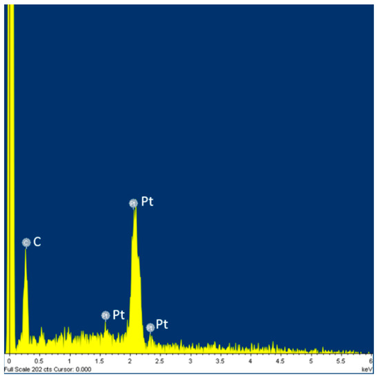 Figure 9 shows SEM images of a MEA after CNT growth. A zoomed-in image of the electrode tip shows forest-like vertically-aligned CNTs characterized by a typical length in the order of 600 nm and a diameter between 25 nm and 30 nm. We can distinguish the presence of Pt particles at the end of CNTs (Figure 9c). It is noteworthy that the length of the CNTs can be varied by tuning the PECVD growth conditions such as temperature, pressure, time of growth, etc. [36]. Energy dispersive X-ray (EDX) spectroscopy confirms the presence of Pt and C at the tip of the electrodes (Figure 10).