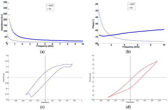 Impedance spectroscopy and cyclic voltammetry of Pt- and CNT-coated electrodes: (a) magnitude of impedance as a function of frequency; (b) phase of the impedance as a function of frequency; (c) CV curves for Pt-coated electrodes; and (d) CNT-coated electrodes under similar conditions.