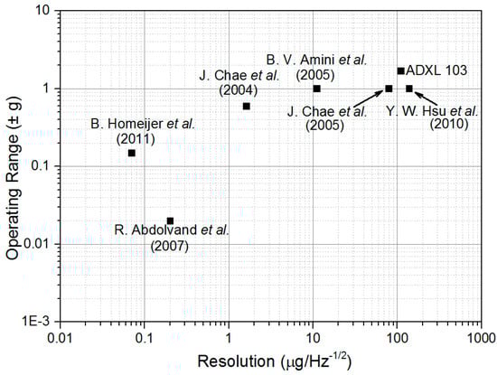 Figure 1. Performance of some reported in-plane MEMS accelerometers.