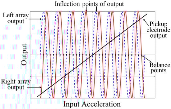 Depending on the sensing mode, the design can be divided into two types: variable area and variable gap capacitance sensing. Generally, in consideration of the differential output, the latter presents better sensitivity. However, in some applications, the poor sensing linearity and the small dynamic range of this sensing mode are usually identified as the bottleneck. To improve resolution, the simplest approach is to enhance output variation corresponding to a certain displacement, which means the slope of the output must have a greater absolute value. However, it is impractical to achieve a very steep output increase (or decrease) in a large operating range. Recently, Pike et al. [,] proposed a remarkable capacitive nano-g MEMS seismometer design. The researchers employed a rough linear detector and a fine periodic array transducer as the capacitive detection system. The rough detector is used for an approximate position determinant of the proof-mass in the operating range. The fine periodic array transducer gives a sinusoidal output, which could provide an ultrahigh resolution in a narrow band. By combining these two signals, the sensor can detect a nano-g signal in the entire operating range. Their latest device was used in the InSight mission to Mars. It can measure the vibration variation down to 2 ng/√Hz []. Its operational range is designed for a seismometer application, making it insufficient for gravity measurements.