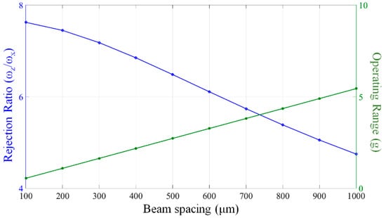 where ωz is the resonant frequency for the z-mode, E is the Young’s modulus of silicon, c is the elbow compliance factor (c = 1.2 in our design []), Ix is the area moment of inertia about the x-axis, G is the modulus of rigidity, J is the torsional constant for spring beam about the z-axis and Iz is the area moment of inertia about the z-axis. In order to minimize the mechanical noise and increase the operating range, we need to enlarge the beam spacing. However, it is apparent from (3) that the rejection ratio for the z-mode becomes worse while increasing the beam spacing. Figure 5 shows the rejection ratio of the z-mode to the fundamental mode and evolution of operating range as a function of beam spacing (using six folded springs for each side of the proof mass). It can be observed that the rejection ratio and the operating range need to be balanced during design. Finally, the beam spacing is chosen to be 480 μm, which could satisfy the requirements of rejection ratio and operating range in our design. The overall dimension of the suspended die is 44.5 mm × 32.2 mm.
