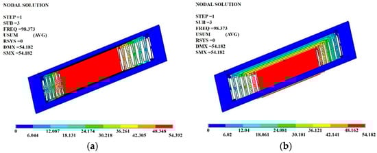 Figure 6. FEM simulation results of the vibration mode. (a) Fundamental mode that the vibration in the sensing axis; (b) mode perpendicular to red plane on the mass (z-mode).