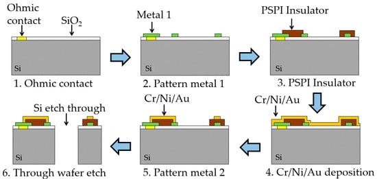 Figure 7. Schematic illustration and process flow for the complete suspension fabrication with metal and insulator layers.