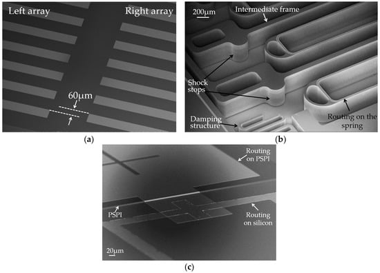 Figure 8 presents the packaged MEMS, suspended proof-mass structure, top cap, and bottom cap. Some details are illustrated in Figure 9. In order to obtain a phase difference of π/2, the left and right arrays are deliberately staggered for 60 μm in the sensitive direction (Figure 9a). The intermediate frames and springs are also shown in Figure 9b. We can observe some shock stops and a damper structure, which are designed for protection purposes in case of overload. They are located at the corner of the external frame and at the edge of the intermediate frames. Figure 9c shows the SEM image of the PSPI insulator.