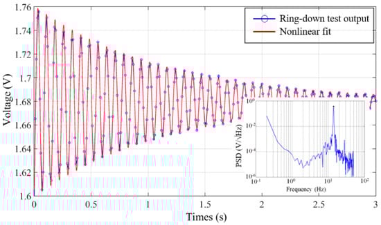 Figure 12. Ring-down test output of packaged MEMS accelerometer. Lower-right inset: power spectrum density (PSD) of ring-down test output.