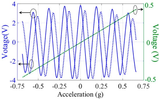 A commercial spring accelerometer is employed in the static calibration. Figure 13 shows the open-loop output response (calibration results) of our MEMS accelerometer to an acceleration variation about ±0.7 g, which is provided by tilting its sensitive axes in a local gravity field. As expected, we have successfully obtained a linear response and two sinusoidal signals. The linear response is given by the elementary capacitive pickup electrodes, which are used for a rough acceleration measurement at micro-g level in a large operating range. The measured sensitivity is, accordingly, about 0.26 pF/g. The measured system noise floor of elementary capacitive electrodes presents at a level of 10 μg/√Hz. The sinusoidal outputs are given by the left and right periodic-sensing-array transducers, which are used for extreme high resolution (nano-g) measurements in a small range around the balance point. The staggered left and right arrays guarantee that the inflection point of one periodic-sensing-array transducer output can be avoided by an alternate operation. Consequently, the measurement system could always work in the most sensitive areas. The sinusoidal outputs presented a capacitive sensitivity of 53 pF/g, and the corresponding sensitivity is 122 V/g. By combining the rough linear output and the precise sinusoidal outputs, our MEMS could provide a high-resolution measurement in the entire operating range. In addition, a dynamic measurement is also applied, and the MEMS could provide an excellent output as well. However, as shown in Figure 13, it is clearly seen that the magnitudes of the sinusoidal outputs are nonidentical. It is apparent that there is an envelope, and the maximum magnitude appears around zero input. As mentioned previously, although five intermediate frames are introduced in our design to increase the stiffness of the suspension along the z-axis, the proof mass will still have a vertical sag under gravity. By tilting its sensitive axes in a local gravity field, the x-axis component of the gravity that is parallel to the plane of proof-mass provides input acceleration for calibration purposes. Meanwhile, the vertical sag of the suspension is caused by the z-axis component of the gravity which is perpendicular to the plane of the proof-mass. Apparently, the vertical sag is not identical with different tilt angle, which leads to the variation in the maximum output of the sinusoidal signals.