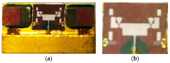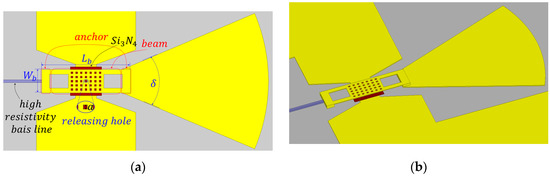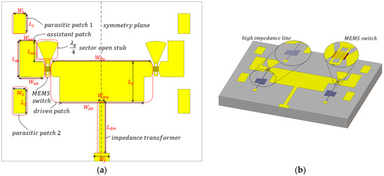 As shown in Figure 2, the RF MEMS switch is terminated by a λg/4 sector open stub and a high resistivity bias line, which is used to apply the direct current. To alleviate the influences on return loss and resonant frequency, the λg/4 sector open stub is employed, which has many advantages such as miniaturization of struction and the convenience of connection. The dielectric shown in Figure 2a,b is Si3N4 with a thickness of 0.15 μm, and it is used to separate the beam and the signal line when the air gap is 0 μm. By actuating the RF MEMS switches using the direct current, the gap between the beam and the signal line varies from 0 to 1.5 μm (i.e., down state to up state). The down or up state determinate whether the assistant patch is connected to the driven patch, i.e., when the switch is in the down state (the gap is 0 μm), the assistant patch is detached from the driven patch, and vice versa.
