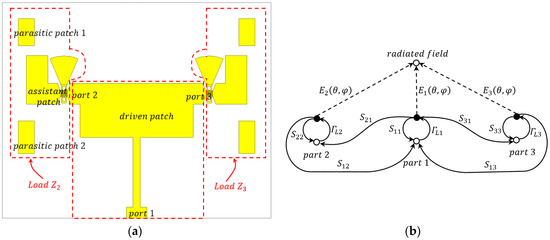 As shown in Figure 3, the driven patch (part 1) is terminated by load Z2 and load Z3. The regular scattering matrix Sr includes three ports, and S32 and S23 are all approximately equal to zero because the couplings between load Z2 and load Z3 can be neglected. According to the symmetry of the designed antenna overall structure, S13 = S12 and S31 = S21, respectively. Thus, Sr is defined as