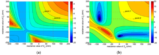 The simulation results show that the input impedance of Port 2 or Port 3 is always inductive and the real part of the input impedance is so small that it can been neglected. The return loss and the gain at φ = 90°, θ = −20° of the proposed pattern reconfigurable antenna are shown in the contour maps (Figure 4a,b, respectively). In Figure 4, the horizontal axis and the vertical axis are the reactance value of load Z2 and load Z3. In order to alleviate the contradiction between the return loss and the gain, the two points in Figure 4 are selected to reconfigure the radiation pattern of the proposed antenna. In these two points, the return loss of the proposed antenna is approximately 10 dB, and the gain reaches approximately 5 dB.