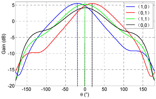 The value of load Z2 and Z3 can be reconfigured among Point 1 and Point 2 shown in Figure 4 by changing the operating modes. Each RF MEMS switch has two states, i.e., an up state (0) and a down state (1). The input impedance of the Part 2/Part 3 is (0.0808 + j1.1140) × 87.5 Ω ≈ (7 + j98) Ω in the “0” state, and (0.05 + j0.3503) × 87.5 Ω ≈ (4 + j31) Ω in the “1” state according to the simulated results, the value of the 87.5 Ω is the characteristic impedance of the port. Thus, the load conditions of the driven patch have four kinds of combination, as shown in Table 4. Fortunately, if the real part of the input impedance (in RF MEMS switch “0” or “1” states) is neglected, the reactance value of the two points in Figure 4 will be reached by changing the RF MEMS switch operating modes among (1,0) and (0,1), i.e., Point 1 corresponding to RF MEMS switch state (1,0) and Point 2 corresponding to (0,1). Therefore, the main lobe direction of the proposed pattern reconfigurable antenna can be steered by changing the RF MEMS switch operating modes. The simulated gain results of the proposed RF MEMS pattern reconfigurable antenna are shown in Figure 5.