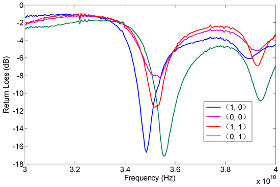 Input impedance of all operating modes at the desired frequency of 35 GHz is essential. The return loss of the proposed antenna was measured with the network analyzer Agilent PAN N5442A. The antenna was fed with a 50 Ω microstrip line, and the input impedance of the antenna was transformed by a transformer. The measured return losses of all modes were approximately 10 dB at the desired frequency of 35 GHz, as shown in Figure 7. Thus, the manufactured antenna has acceptable return loss performance.