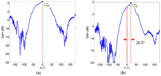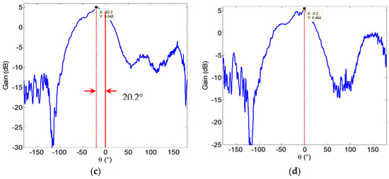 By changing the mode of the RF MEMS switches, the antenna is capable of switching among four operating modes (00, 01, 10, 11; the “0” represents the up state, and the “1” stands for the down state) and achieving three pattern reconfigurable states in the yoz plane (φ = 90°) accordingly, because two of the operating modes are at the same pattern reconfigurable state. According to the measurement results of the fabricated pattern reconfigurable antenna, the three reconfigurable radiating patterns at operating frequency 35 GHz were obtained, i.e., left (approximately −20°), middle (approximately 0°), and right (approximately +20°), respectively. The detailed results of the reconfigurable radiating pattern main lobe direction and its associated RF MEMS switches operating modes are shown in Table 2.