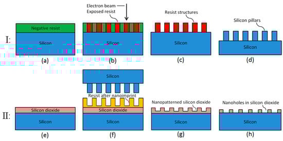 The fabrication process of SiO2 nanoholes is schematically illustrated in Figure 1, which includes the fabrication of a Si stamp (Section I) and the production of SiO2 nanoholes using the Si stamp (Section II). The fabrication process of the Si stamp employs EBL assisted with negative resist for nano-patterning followed by a deep reactive-ion etching (DRIE) process to produce Si pillars ((a)–(d)). Afterwards, the Si stamp was employed in a NIL process for nano-patterning followed by a reactive-ion etching (RIE) process in order to transfer the pattern to the SiO2 layer ((e)–(h)).