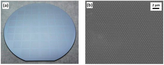 Images of a four-inch Si stamp after electron-beam lithography (EBL), DRIE, and removal of resist: (a) Image of the Si stamp taken by camera. (b) Top-view scanning electron microscopy (SEM) image of the Si nanopillars related to the exposure dose of 40 µC/cm2.