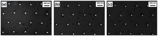 Top-view SEM images of Si nanopillars with different diameters resulting from corresponding different doses: (a) 40 µC/cm2; (b) 34 µC/cm2; (c) 28 µC/cm2.