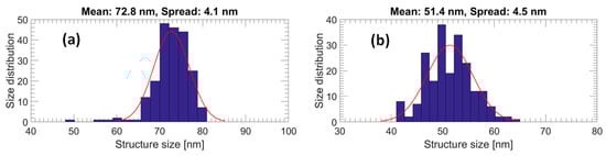 Generally, a higher dose results in a larger pillar diameter and a higher pillar yield. To be more precise, doses from 26 to 40 µC/cm2 result in Si nanopillars with diameters from 40 to 70 nm. Si pillars related to doses lower than 28 µC/cm2 have a considerably low yield. Figure 4 shows top-view SEM images of Si nanopillars related to exposure doses of 40 µC/cm2 (Figure 4a), 34 µC/cm2 (Figure 4b), and 28 µC/cm2 (Figure 4c), respectively. As a consequence of having a variety of resist pillar diameters on the stamp, there will be a local difference in the Si etch rate due to the aspect ratio dependent etching (ARDE). In the present work, this means that the Si pillar height ranges from 85 to 105 nm as the exposure dose is varied from 26 to 40 µC/cm2. Size distributions of nanopillars exposed by doses of 40 and 28 µC/cm2, respectively, are shown in Figure 5 presenting Gaussian distributions. The size distribution was analyzed by importing the SEM top-view picture into a Matlab program (R2015b, MathWorks, Natick, MA, USA) which can convert the picture to a binary one with a structure color in white and background color in black and extract the pillar diameter from the area in white. A total area of 10 µm × 6 µm on the stamp containing around 200 Si nanopillars was used to obtain the distribution. The mean diameters are 72.8 and 51.4 nm for Si nanopillars related to 40 and 28 µC/cm2, respectively, with diameter variations of around 4 nm. It is shown that a lower exposure dose in EBL can result in a smaller structure size.
