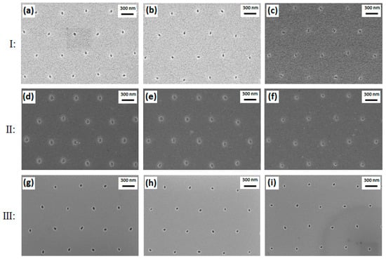 Top-view SEM images of nanoholes with different diameters resulting from corresponding nanopillars realized by different doses: Nanoholes in resist after nanoimprint (Section I): (a) 40 µC/cm2; (b) 34 µC/cm2; (c) 28 µC/cm2. Nanoholes in resist after residual resist removal by RIE (Section II): (d) 40 µC/cm2; (e) 34 µC/cm2; (f) 28 µC/cm2. Nanoholes in SiO2 produced by combined RIE and wet etching (Section III): (g) 40 µC/cm2; (h) 34 µC/cm2; (i) 28 µC/cm2.