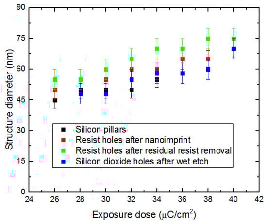 In fabrication of nanoholes in the SiO2 layer by NIL assisted with RIE, the Si pillar diameter can significantly affect the diameter of the final SiO2 nanohole. Furthermore, the structure size varies during the different process steps including the nanoimprint in the resist, the removal of residual resist by RIE, the 30 nm etch of SiO2 to produce nanoholes by RIE, and the final 6 nm wet etch of SiO2 to expose the Si surface underneath. Hence, the diameter of the nanostructures was monitored after each process step to sort out the effect of them separately on the structure size.