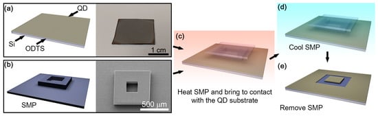 On a high precision translational and rotational mechanical stage, the prepared Si–ODTS–QD substrate is placed. The SMP stamp is attached to an indium tin oxide (ITO) heater designed to generate heat to increase temperature to 100 °C upon 16 V bias by an external power source. This ITO heater with the SMP stamp is attached to a fixture, which is placed over the Si–ODTS–QD substrate. An optical microscope is located over the ITO heater, with which all patterning steps are monitored during the procedure. After heating the SMP stamp above Tg, which makes the stamp compliant, the mechanical stage with the Si–ODTS–QD substrate is manually raised and brought into conformal contact with the SMP stamp with minimal preload as depicted in Figure 1c. While the preload was applied, the stamp was cooled below Tg as shown in Figure 1d to induce high pull-off force to remove the QDs from the substrate. Subsequently, the SMP stamp and the Si–ODTS–QD substrate was separated at ~2 µm/s, which removed the QDs on the contact area as schematically shown in Figure 1e.