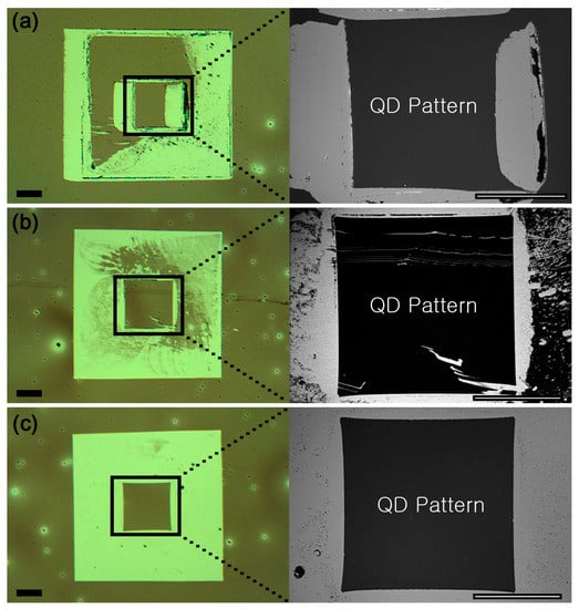 Transfer printing with a structured polydimethylsiloxane (PDMS) elastomeric stamp requires certain thresholds with respect to the applied preload when the PDMS stamp is making a contact with a QD film and with respect to separation rate, i.e., peeling rate, for proper patterning [,]. This method suffers from inconsistent patterning due to weak adhesion between the QDs, high preload, a high peeling rate, and poor resolution. Introducing water-soluble polyvinyl alcohol (PVA) can enhance transfer of QD films to PDMS stamps and improve patterning yields, but the process still suffers from high preload, high peeling rate, and moderate resolution []. Recently introduced intaglio transfer printing has successfully demonstrated ultra high resolution, but the drawback of the high preload and high peeling rate (10 cm/s) still remains [].