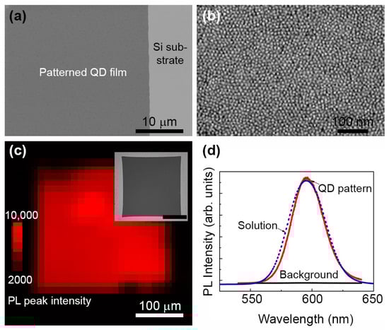 The variable size, shape, and composition of colloidal semiconductor quantum dots (QDs) permit convenient tailoring of electrical and optical properties [,,,]. In addition, solubility of colloidal QDs in a variety of solvents can be beneficial to low-cost, large-area manufacturing compared to conventional micro-manufacturing []. In particular, the use of solution-based fabrication techniques [,,] has attracted much attention for next-generation devices from colloidal QDs in the fields of light-emitting diodes (LEDs) [,,], solar cells [,,,], and thin film transistors (TFTs) [,]. While solubility allows for convenient spin-casting of thin films of QDs, further processing of the deposited films is limited due to solvent stripping/damage that can easily occur, which then hinders the broader adoption of QDs for such photonic and electronic devices. In this context, direct patterning of QD through both additive and subtractive means has been studied. Additive patterning schemes such as dip-pen and polymer pen nanolithography have successfully demonstrated patterning of a single QD resolution [,,]. On the other hand, subtractive patterning of QD films through transfer printing-based mechanical peeling using elastomeric stamps has been investigated and high-quality transferred films have recently been demonstrated [,,,].