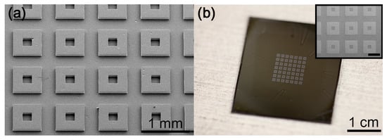 For the fabrication of SMP stamps, a SU-8 (SU-8 50, MicroChem, Westborough, MA, USA) mold was first made. A Si wafer was thoroughly degreased with acetone and isopropyl alcohol. Then, the Si wafer was treated with oxygen plasma for further cleaning. SU-8 was then spin-coated to form a 50 µm thin layer on the Si wafer. After a soft baking process on a hotplate at 65 °C for 6 min and at 95 °C for 20 min, the SU-8 layer was patterned through UV exposure with a pre-designed FeO2 mask. Post exposure baking on a hotplate at 65 °C for 1 min and 95 °C for 5 min and developing with SU-8 developer resulted in a 50-µm-thick SU-8 mold. For the double molding process, a SU-8 mold on a Si wafer was coated with trichloro-1H,1H,2H,2H-perfluorodecylsilane (FDTS) through molecular vapor deposition (MVD) to form an anti-stick monolayer. After fully mixing and degassing, a PDMS precursor was carefully poured into a SU-8 mold and cured in a convection oven at 60 °C for 120 min. The PDMS mold was then used for the successive SMP molding process. A previously developed SMP, NGDE2 with Tg of ~40 °C [], was used in this work. A mixed SMP precursor was poured into the PDMS mold and cured between the mold and a glass slide in a convection oven at 100 °C for 90 min. Final demolding of the SMP from the PDMS mold leads to a SMP stamp 50 µm in thickness on the glass slide as shown in Figure 1b.